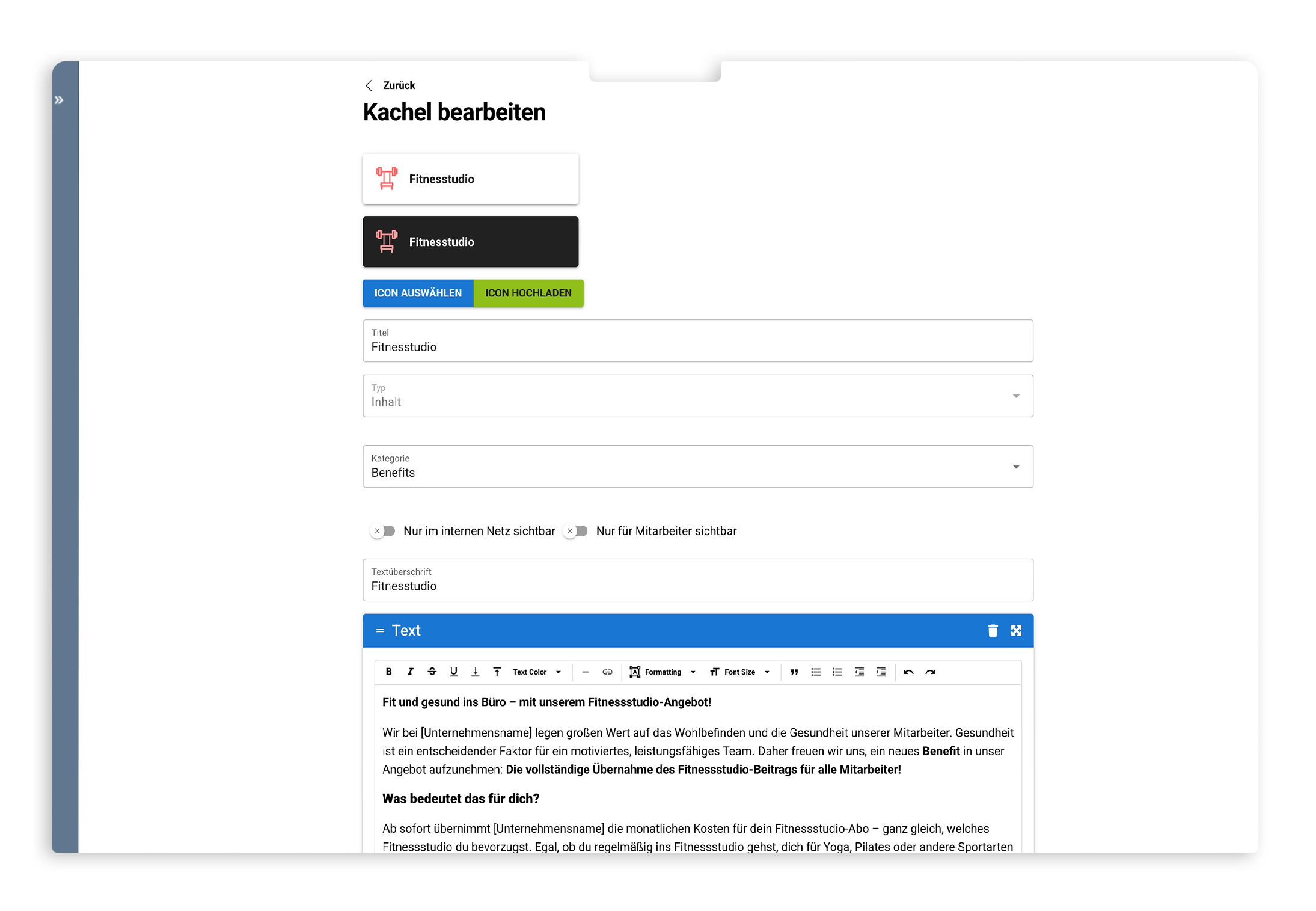 Auch die Struktur ist schnell im Griff: Kacheln werden Kategorien zugeordnet, per Drag & Drop sortiert und bei Bedarf deaktiviert oder später wieder aktiviert. Für Wiedererkennung sorgt das Styling pro Kachel: Icon auswählen, Farben festlegen und das jeweils für Light- und Darkmode. Zusätzlich kann gesteuert werden, wer was sieht – zum Beispiel nur im internen Netz oder nur für Mitarbeitende.